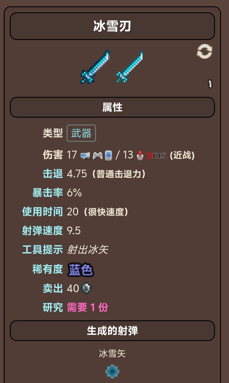 冰雪刃:比较快的挥砍速度,还能发射发光的子弹,削弱版的附魔剑