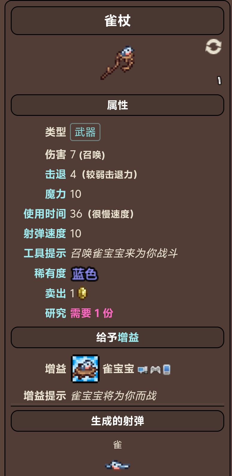 雀杖可以在生命树的宝箱中找到,作为召唤杖,在你将随从召唤完毕后,召唤物可以自动为你攻击