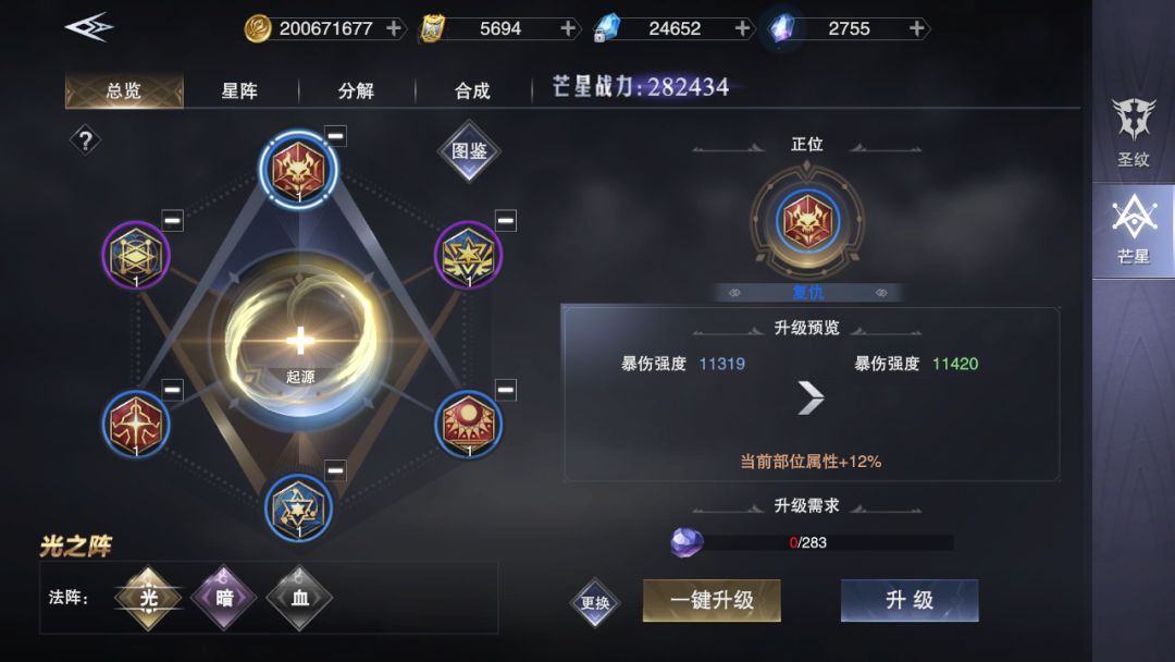 芒星的法阵共有3类:光之阵、暗之阵、血之阵。三类阵法会提供不同的属性。开启阵法则需要“启迪星盘”。