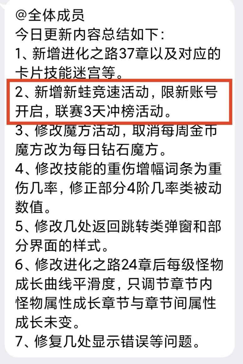 作者大大一上来就放大招,突然在群里宣布了一个重磅更新,凡是在2024.9.10 16:00后进入游戏的都会新增一个[新蛙竞赛活动]!!!