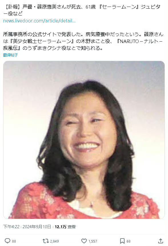 9月10日,媒体消息称,曾为《火影忍者》漩涡鸣人母亲漩涡玖辛奈配音的声优筱(篠)原惠美, 因病已于本月8号去世,享年61岁。