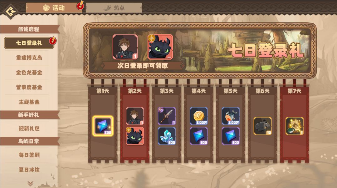 博克岛上最知名的就是以小嗝嗝为首的龙骑手以及他们的“传奇龙”了。在全新玩法“博克岛冒险团”中,将不再限制龙骑手们使用“传奇龙”,可以尽情部署包含“没牙仔”、“风里飞”、“肉球”等在内的传奇龙来进行独特的冒险故事。“博克岛冒险团”为每周玩法,每周都将获得一定的次数,并且会持续更新新的故事副本;通过副本后,龙骑手们也将获得更多的龙骑手信物,帮助大家解锁与升级龙骑手与他们的传奇龙。