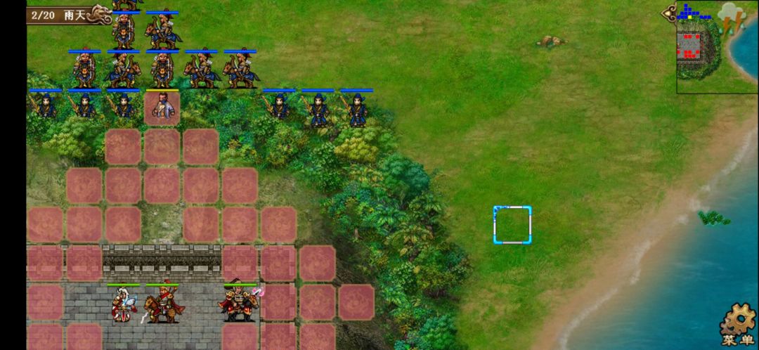 开场全员向下移动,避免进入对方远程法师和弓箭手的攻击范围,有伞的两人可以向上方城墙靠。张辽、文聘、曹洪吃强行。