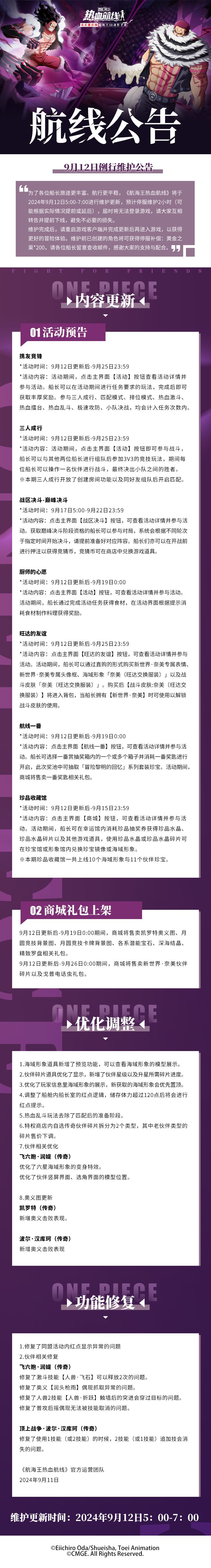 为了各位船长旅途更丰富、航行更平稳,《航海王热血航线》将于2024年9月12日5:00-7:00进行维护更新,预计停服维护2小时(可能根据实际情况提前或延后),届时将无法登录游戏,请大家互相转告并提前下线,避免不必要的损失。