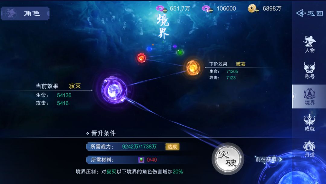 境界突破与战力挂钩,突破境界还需要消耗一定数量的突破丹,境界主要用于PVP竞技,高级境界仙尊可以压制低级境界仙尊,境界越高造成的伤害也会越高。