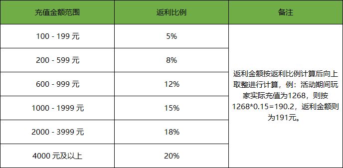 ◆活动内容:活动期间内充值,达到对应充值金额范围,活动结束后将在7个工作日内通过邮件发放对应返利金额,将以代金券形式进行返利。