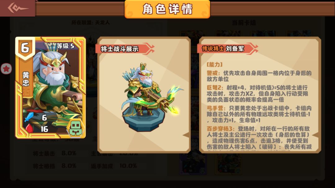 最近更新的全新神将黄忠,对高于5点待机值的将士是毁灭打击的存在。不仅拥有超长攻击距离,而且攻击前对高待机值的将士进行准确狙击,双倍的黄忠伤害直接拉满,甭管什么曹操、严颜、根本没法在这爆炸的输出中存活。而且黄忠本身也有较高的生命值,分裂后仍是较肉的远程将士。