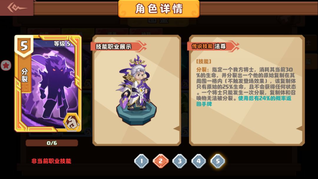 【分裂】是5点待机值的传说技能,可以在辰石商店中兑换获得。技能【分裂】:指定一个我方将士,消耗其当前30%的生命,并分裂出一个他的原始复制在其周围一格内(不触发登场效果),该复制体只有原始的25%生命,且不会获得任何状态。一个将士只能发生一次分裂,复制体和召唤物无法被分裂。使用后有24%的概率返回手牌.