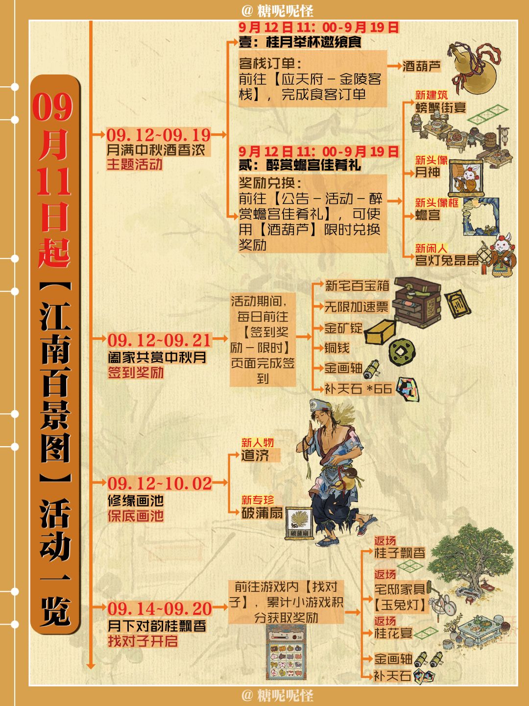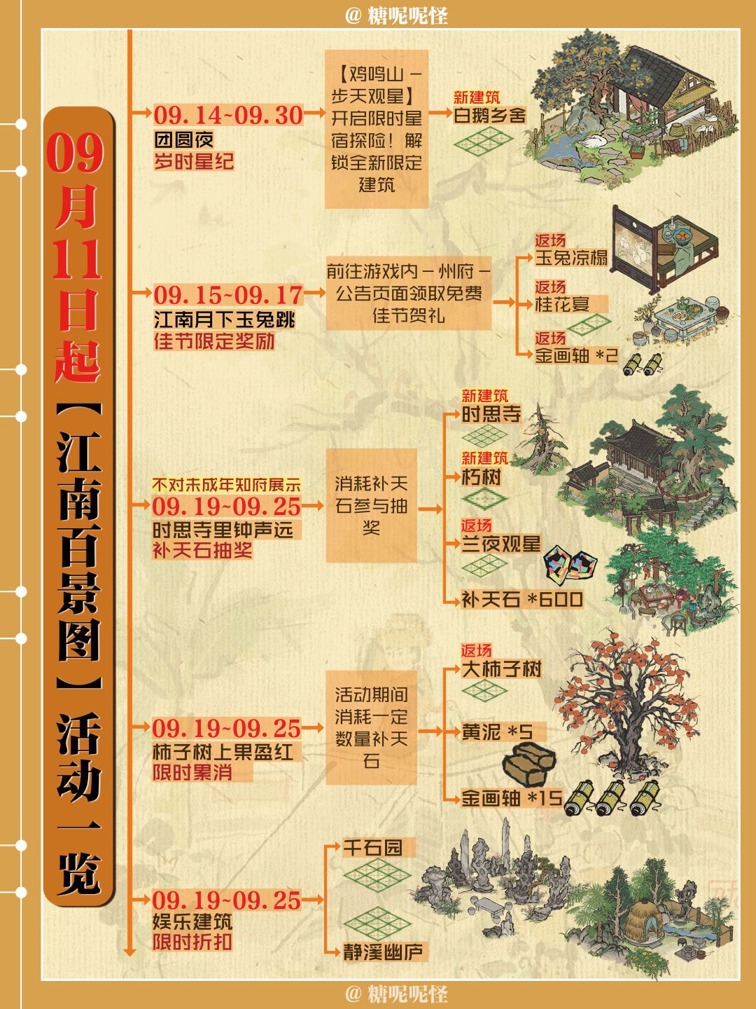 4️⃣返场建筑:月饼摊|兔儿摊|吴刚伐桂|兔子捣药园|几时明月|客舍茶田|客舍茶摊|杏花酒家|腾云寺|桂子飘香|兰夜观星|大柿子树|吉祥长廊|聚流亭|青松荫窗|桂花宴