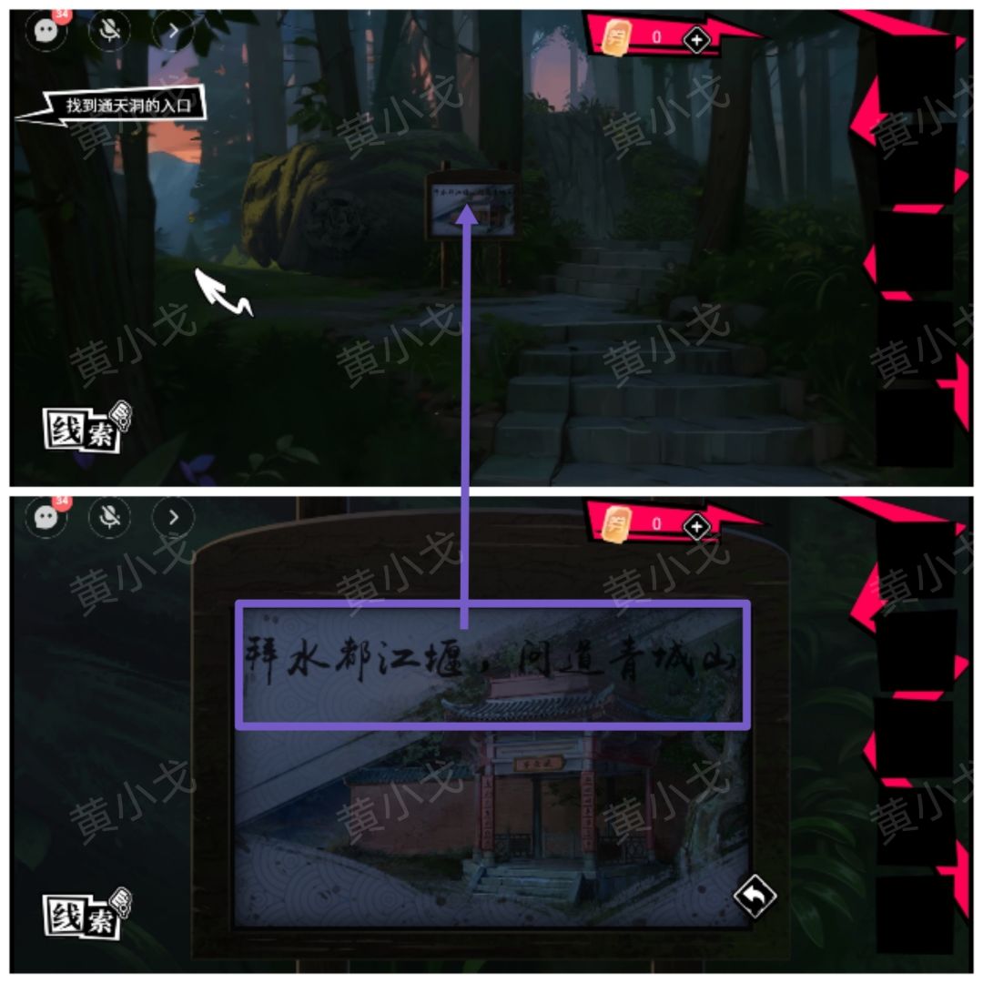 26.(队友装上木块后)根据公告牌上的线索,与队友配合,按顺序点击牌匾上的字(拜水都江堰,问道青城山)