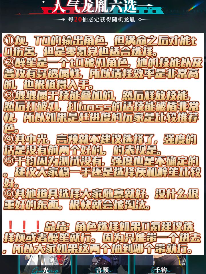 ❗️❗️❗️总结:角色选择如果0氪建议选择灰或者醉笙就行。因为只能带一个进去,所以大家如果这两个抽到哪个带就行。#归龙潮 #游戏种草计划 #归龙潮攻略 #归龙潮公测 #归龙潮913公测 #归龙潮公测打卡 #游戏杂谈 #游戏福利 #预抽卡