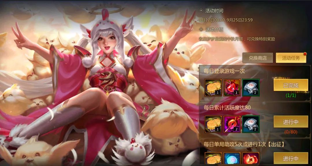 ▼【每日】单局助攻5次或进行1次【出征】,可获得月饼*1、竞技之魂*2、活跃之心*10