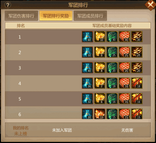 *注:根据各个排名的军团内成员的奖励为——排行1-10名可获得3倍基础奖励,11名-20名可获得2倍基础奖励,21名及之后可获得1倍基础奖励。