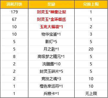 收集指定数量的道具【月饼】,可兑换封灵玉、各种珍稀道具等奖励!