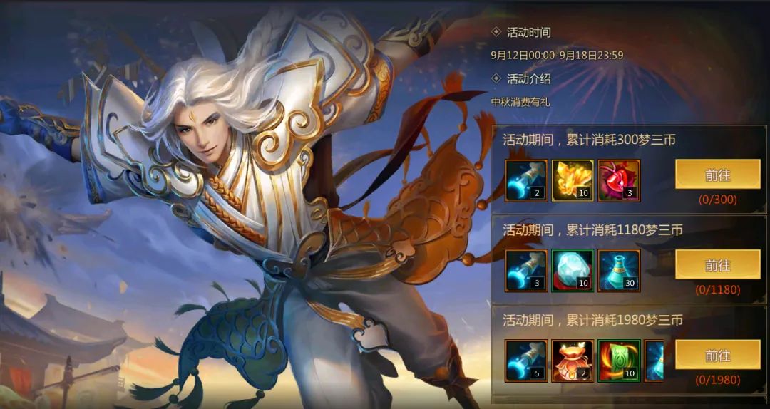 ▼【活动期间累计】消耗2880梦三币可获得月饼*10、暗金书页特惠自选*2、传说虎符精元*3、洗髓露*50