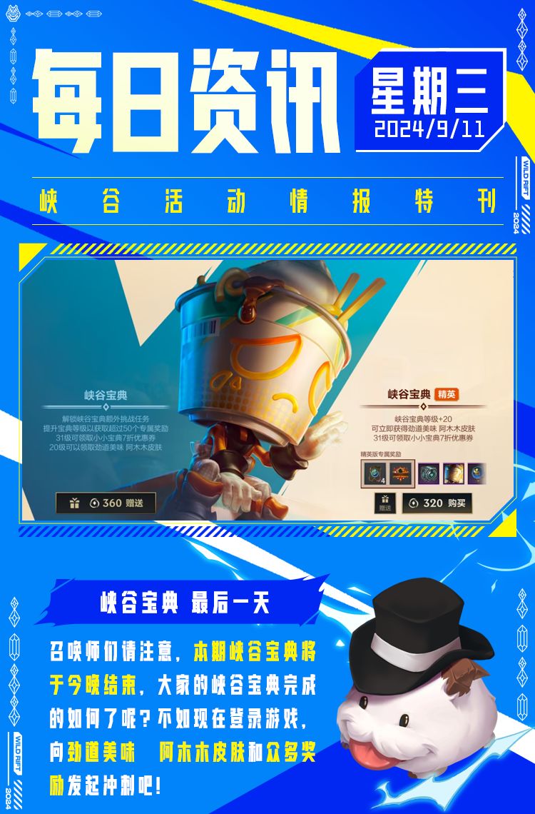 召唤师们请注意,本期峡谷宝典将于今晚结束,大家的峡谷宝典完成的如何了呢?不如现在登录游戏,向劲道美味 阿木木皮肤和众多奖励发起冲刺吧!