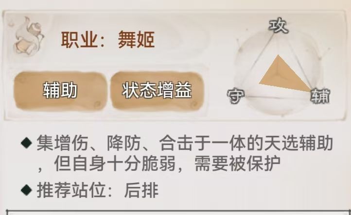 唐蝶衣是一名舞职业的辅助型弟子,她的技能和天命为队伍提供了显著的增益效果。
