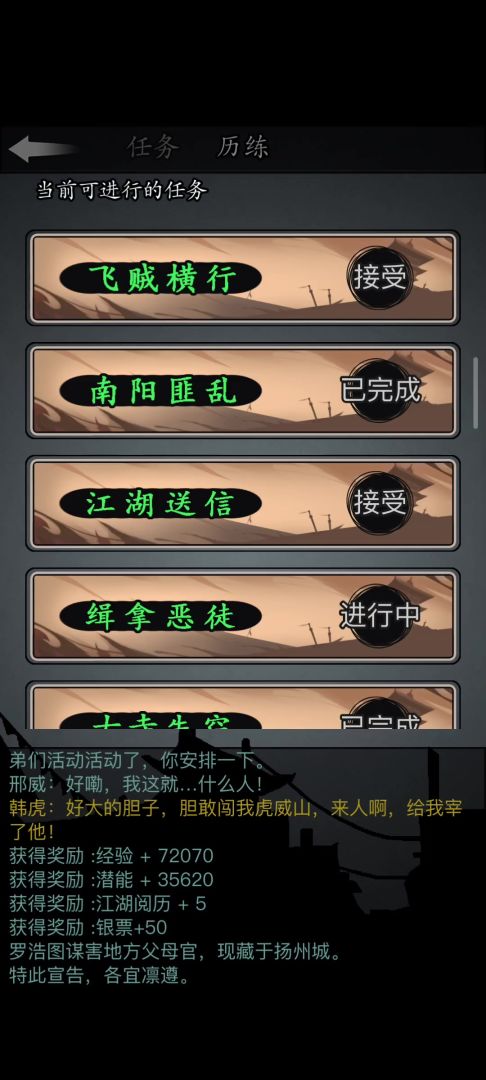 最后,玩家领取和已完成的历练任务,不会出现在任务池中,这意味着我们要优先手打完南阳和古寺的全部次数,防止刷出这俩历练,然后自己领取一个送信/缉拿,再去找门客。这样门客就只会刷出俩日常,池子就会干净很多,刷出经验的概率也会提高。