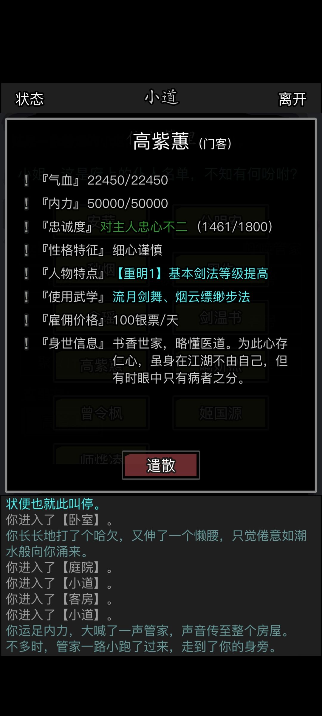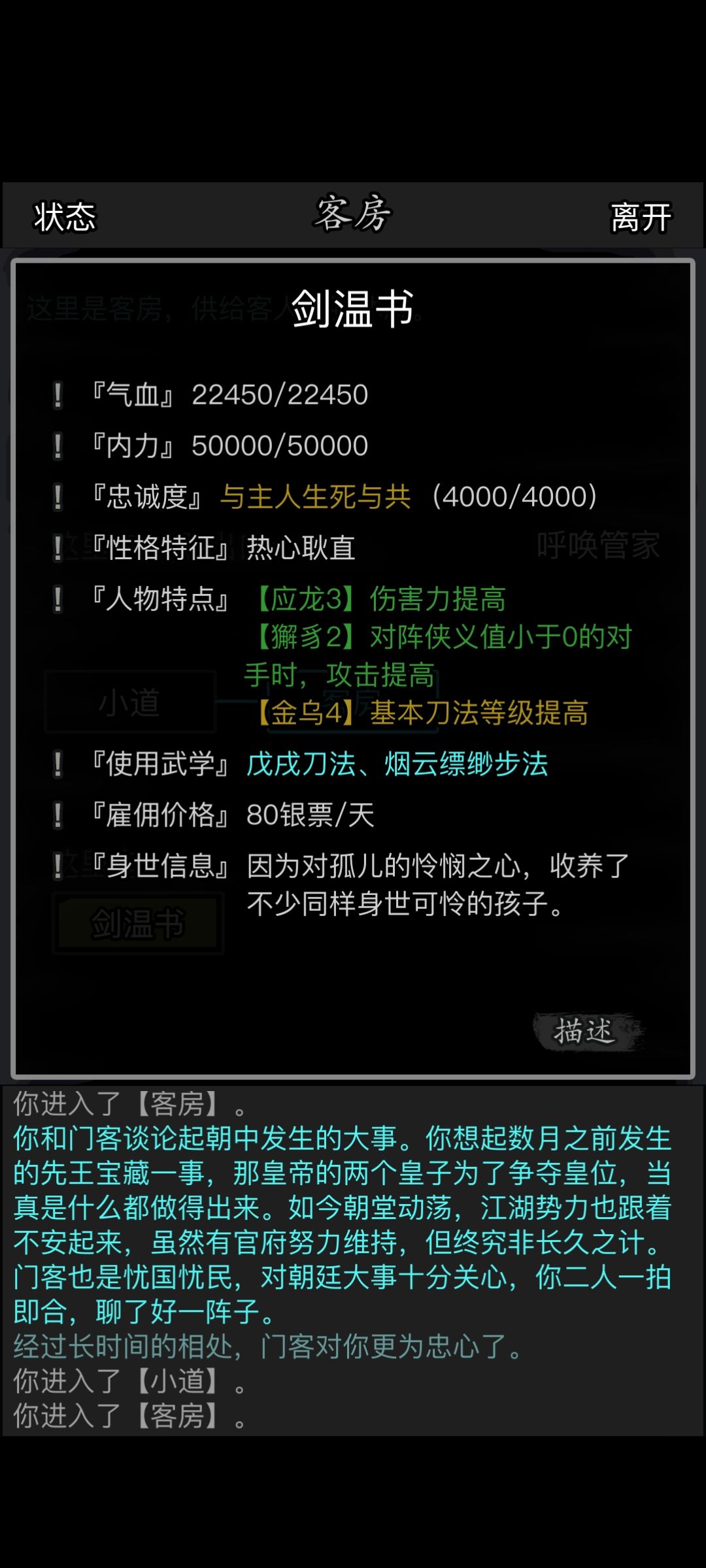 基本武学特性就是提升或降低该门客对应的基本武学,这个也是最关键的。各位少侠可以看我这俩门客