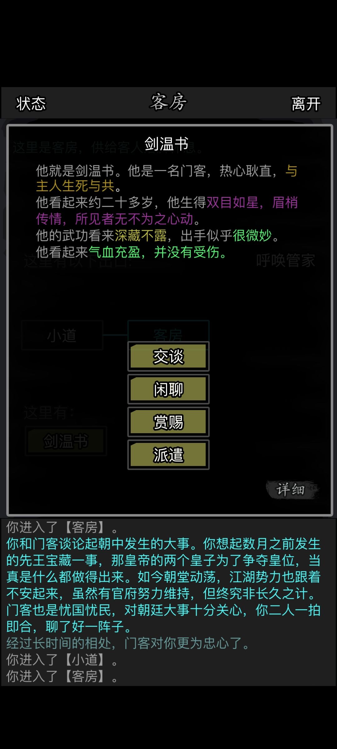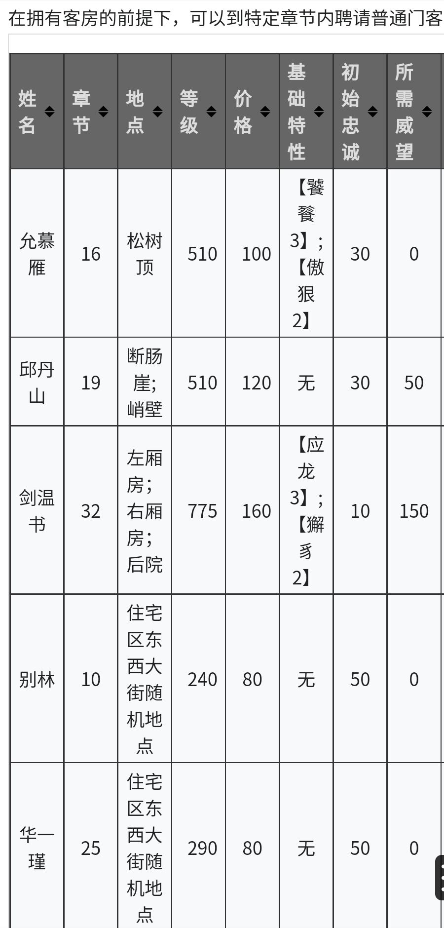 完成时间和次数,各位侠客可能会发现新招的天人门客和邱允二人,无法完成所有历练任务,要重复派遣。因此门客需要尽快提升忠诚度,这样才会更好用