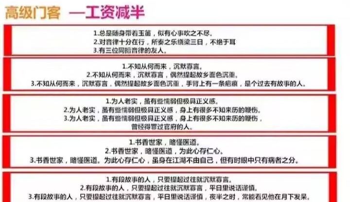 前文说过门客的任务也有权重之分,如果不优先派遣掉高权重的,那么他仍然会有可能刷在你的下一个门客身上,所以,熟记门客的权重也非常有必要: