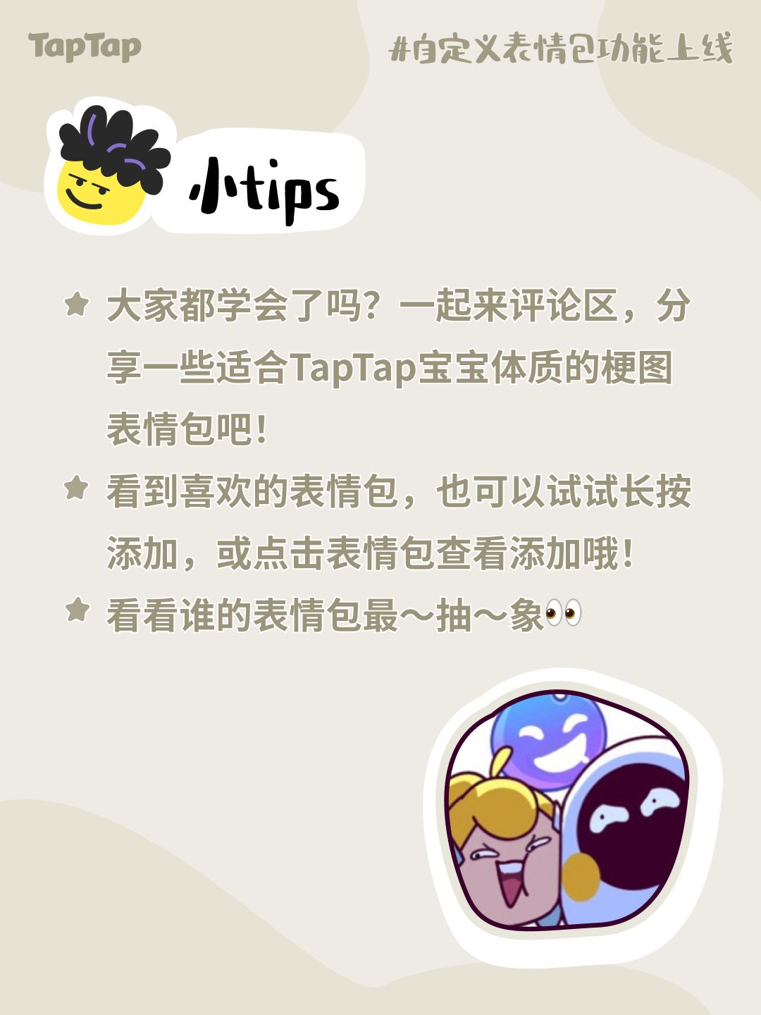 TapTap可以在评论区一键添加表情包了!玩梗斗图,犹如呼吸一般简单~![[表情_酷]](https://img.tapimg.com/market/images/edd50e702f508971043f5619f686740e.png)
