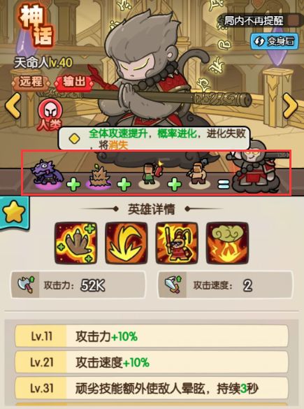 变身时只有只有25%的概率成功,变身之后的猴哥实力非常恐怖,但是失败的代价也很大,游戏对局中辛苦合成的猴哥直接会消失在战场中,所以是非常靠运气的。