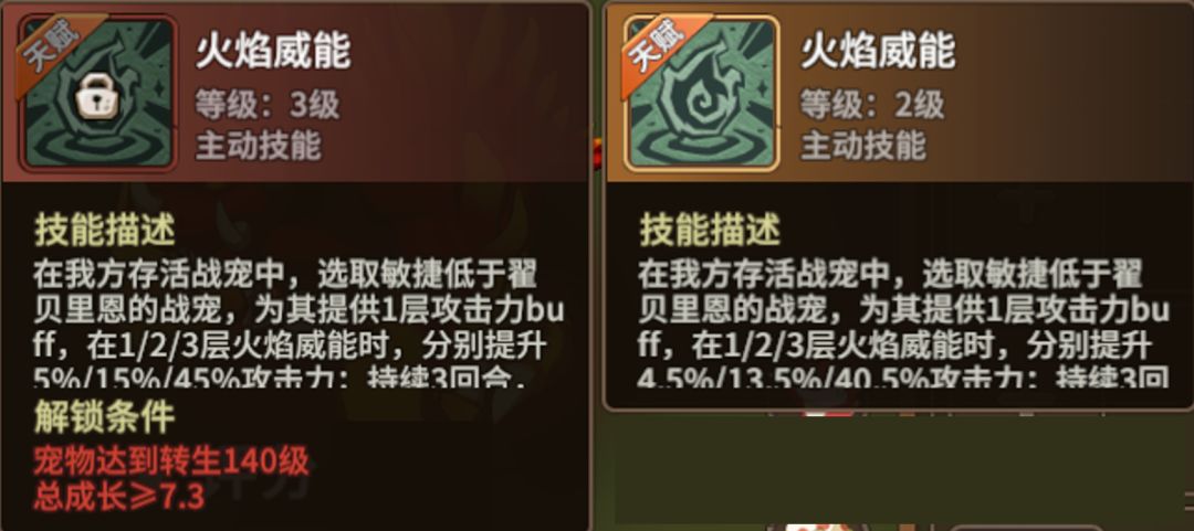 火焰威能:在我方存活战宠中,选取敏捷低于翟贝里恩的战宠,为其提供1层攻击力buff,在1/2/3层火焰威能时,分别提升4.5%/13.5%/40.5%(3级为5%/15%/45%)攻击力;持续3回合,战宠被击倒后buff不消失。