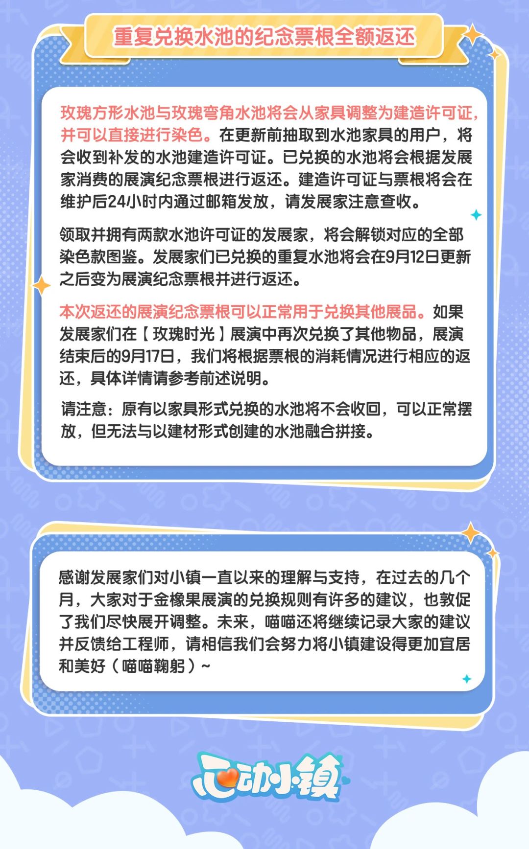 4.玫瑰时光中的玫瑰方形水池和玫瑰弯角水池从家具调整为建材,可以直接染色,之前重复兑换的票根全额返还