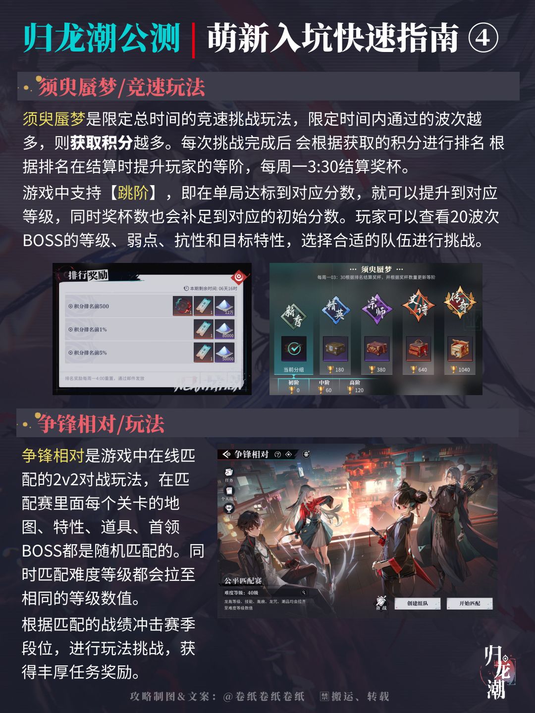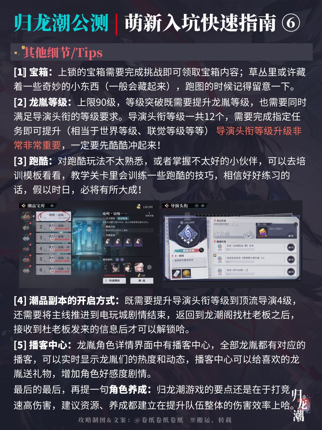 归龙潮终于要开始公测啦!作为首测就参与过游戏的一名攻略作者,卷卷qwq把归龙潮萌新入坑需要了解的游戏小细节都梳理出来啦。总体来说,如果你是资深手游玩家的话,游戏入门是相当容易的事情。但作为萌新玩家,卷卷qwq帮大家总结了几张梳理图,快速了解一下游戏的玩法内容。当然游戏里也有一些值得慢慢去体会探查的内容,也欢迎大家在帖子下面多多交流。![[表情_流口水]](https://img.tapimg.com/market/images/f0320a0494447e27b7123a94b6cbcecf.png)