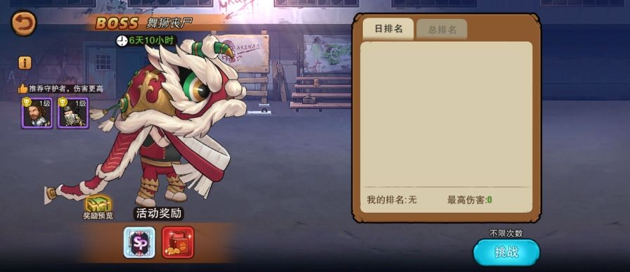 活动期间可对BOSS·舞狮丧尸进行无限次挑战,最高伤害将被计入排行内并对其发放相应的日排行奖励&总排行奖励。
