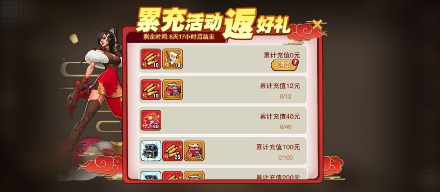 活动期间充值金额达到固定档位即可领取对应奖励内容。