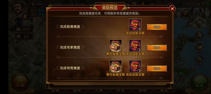 这周和上周差不多,为了节省时间,还是出个十五分钟的攻略吧,这周多的五分钟是民心和征兵分做了两次,曹操城池和钱粮不够,民心任务要开局用铜钱买粮食做任务,不然粮食不够,起码要20万,然后重开选曹操来征兵,后面钱不够就等第二年一月份有钱了再征兵,有人打你就放弃了吧。大概最多第二年二三月就差不多了。