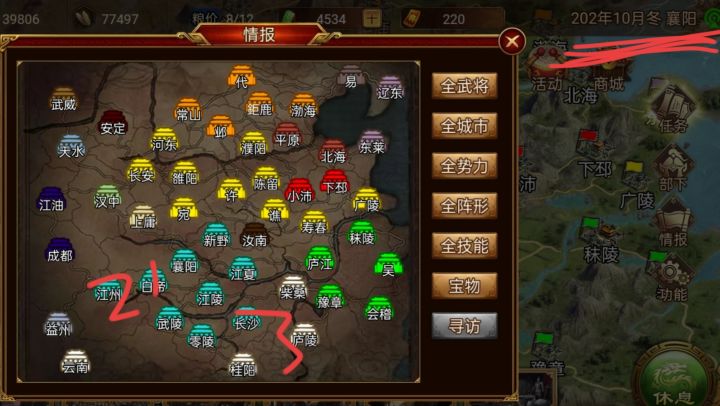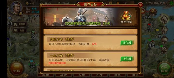 重点是五个城池任务和单兵六万,开局选刘表自带两个女弓,第一个月编成和移动到江陵,黄忠两个女弓带弛射马就行,第二个月就可以打白帝了,不然后面他们会征兵不好打了,第三个月打江州,打完都不要移动就留在江陵。第四个月打长沙,长沙就两个人,注意让黄忠单刷六万,有反射很好打!五六个月就跟着张羡打就行,六个月完成任务!