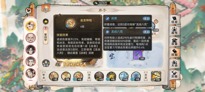 ⁴技能:天一剑典、天雷正法、狂龙战典、煞刑战帖、虚灵妙诀、烈阳真诀、牵魂幽咒,地藏净经。虚灵和地藏主打是功能性,我就不多说了。其他几个技能主要给龙提升伤害,都有以上技能的话优先级是天一>狂龙>煞刑>天雷>烈阳=牵魂。天一面板50%攻击加成以及天一强大的打坦能力无论是人或龙形态下都非常好用所以是首选,狂龙提升攻击力40~50%也很好用,不过这受到自身防御力影响,而且不同玩家的龙人防御和攻击比值也浮动很大,有的人狂龙转换攻击可能只有35%,不过狂龙被动可以回血和抵挡伤害,有时候很关键,适用性广,次选!煞行和天雷属于好用,两个主动性表现差了点,打反手还不错,天雷被动有21%金系威力加成,龙人基本稳吃,威力加成和物伤加成属于同级区间,等同于21%物伤加成,面对爆减环境下,物伤和威力加成都不受影响。煞刑1%生命损失提高0.7%攻击,优点是上限高下限低,特别不稳定,很难吃到全额加成,期望值只能吃到一半,只有35%加成!烈阳和牵魂属于能带还行,有些条件下适用!