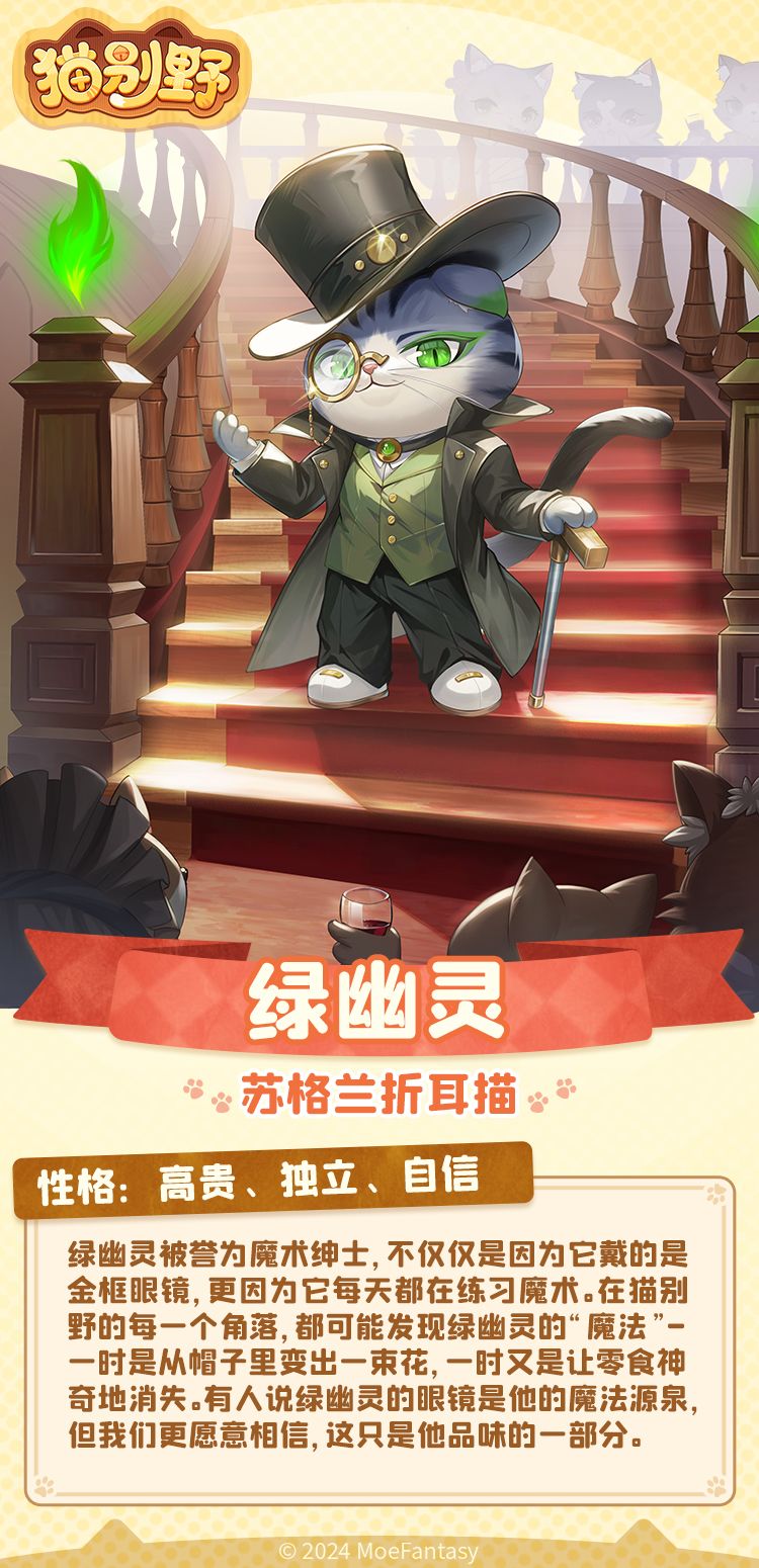 绿幽灵,一只苏格兰折耳猫,尽显高贵之姿。它独立自信,以魔术绅士之名为人称道。金框眼镜加持,更显神秘优雅。每日苦练魔术,别野处处皆是它的魔法舞台。