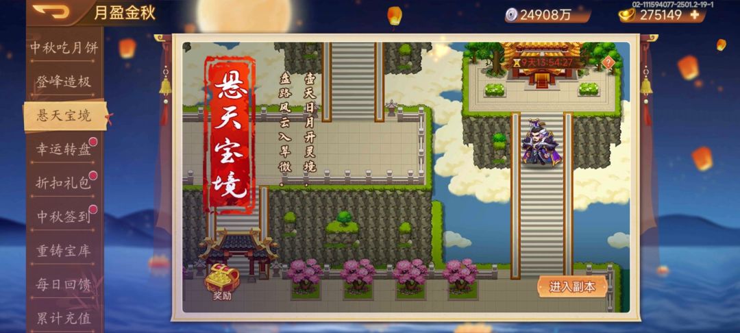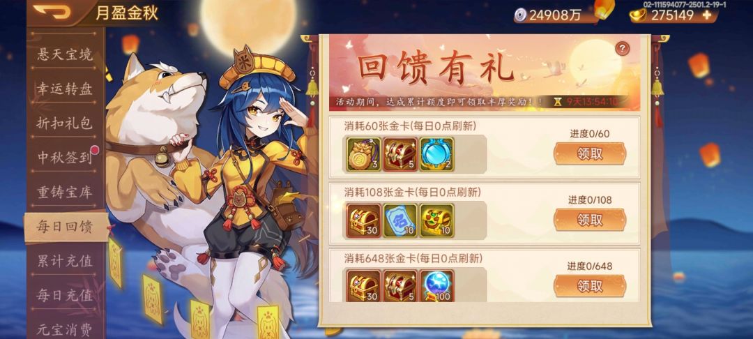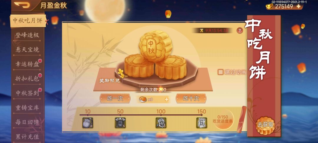 活动说明:活动期间,通过完成任务,元宝消耗等方式获得月饼,在活动界面吃月饼进行抽奖,吃月饼达到指定数还可获得额外奖励;