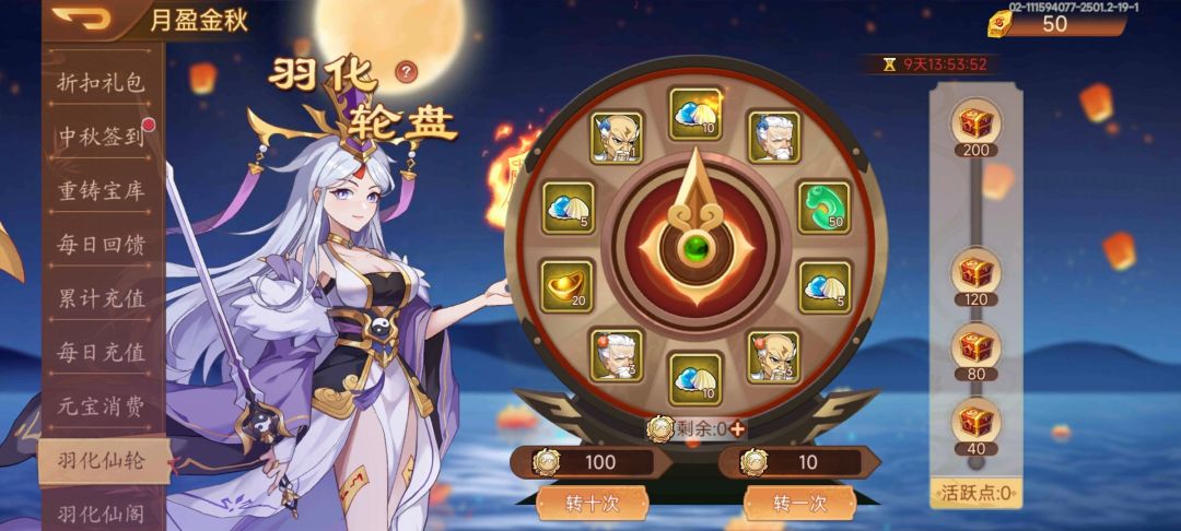 活动内容:活动期间使用“六壬式盘”可以转动羽化仙轮,仙轮概率掉落蓝珍珠、于吉仙魂、于吉资石、水镜仙魂、水镜资石等道具。蓝珍珠可于羽化仙阁兑换奖励。