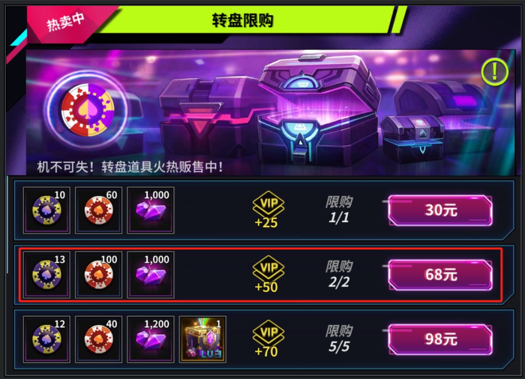 转盘68元限购礼包:很疯狂,这个68限购礼包的性价比相较于转盘周卡都要高上一筹。转盘周卡是高级转盘币有21个会多一点,但是折合活动积分只有106.75积分;这个68限购礼包是高级转盘币少一点但是折合活动积分有164积分。