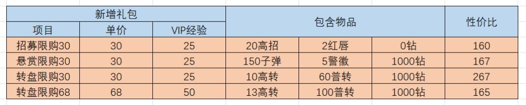 不同礼包横向对比更新如下: