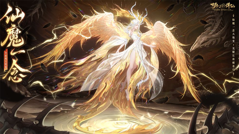 - 「羽翼变身」:拥有[仙魔一念·光夜]的道友,可前往瑰宝商城,使用[璀璨点]解锁全新变身动作——在身后展开一双璀璨夺目的巨大羽翼,如同晨曦初破黑夜,绽放耀眼光芒!