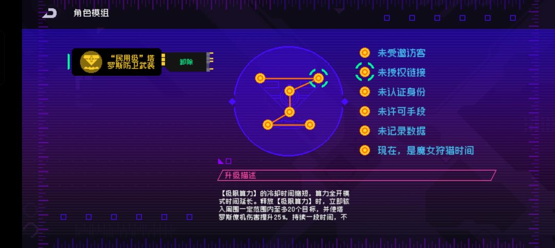 2级效果开启后,希尔主动技能【极限算力】的冷却时间缩短,算力全开模式时间延长。释放【极限算力】时,立即骇入周围一定范围内20个目标,并在一定时间内使塔罗斯僚机伤害提升25%伤害。