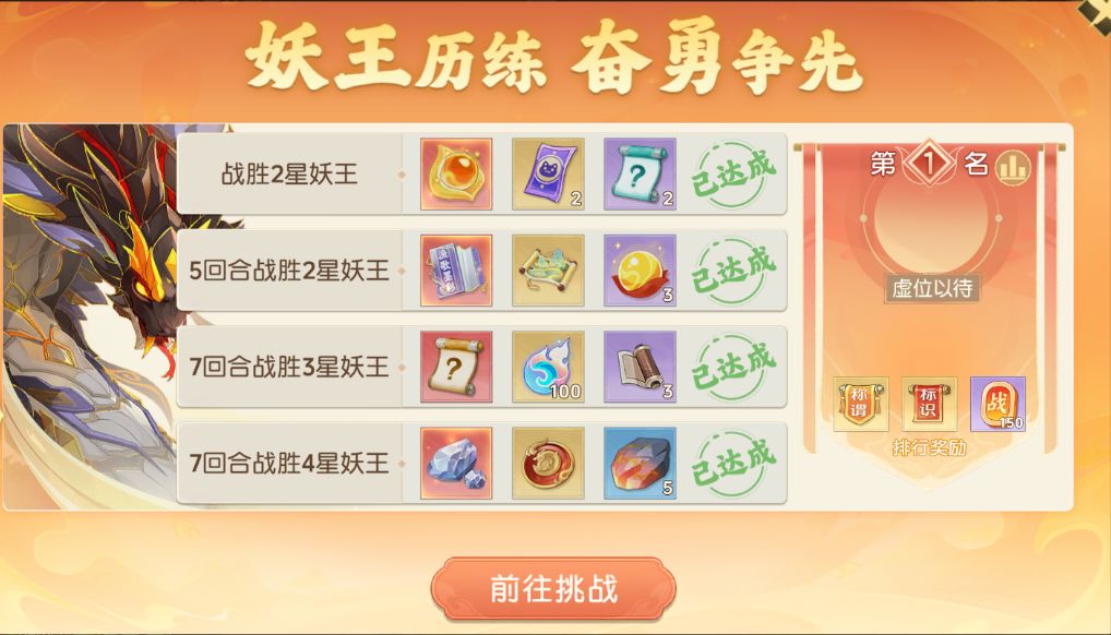 2、妖王历练的奖励也将在今天结束,以目前的神通和契灵来说,相信各位寻火者拿到所有的妖王历练奖励是很轻松的!各位记得去挑战妖王,获取全部奖励哦!