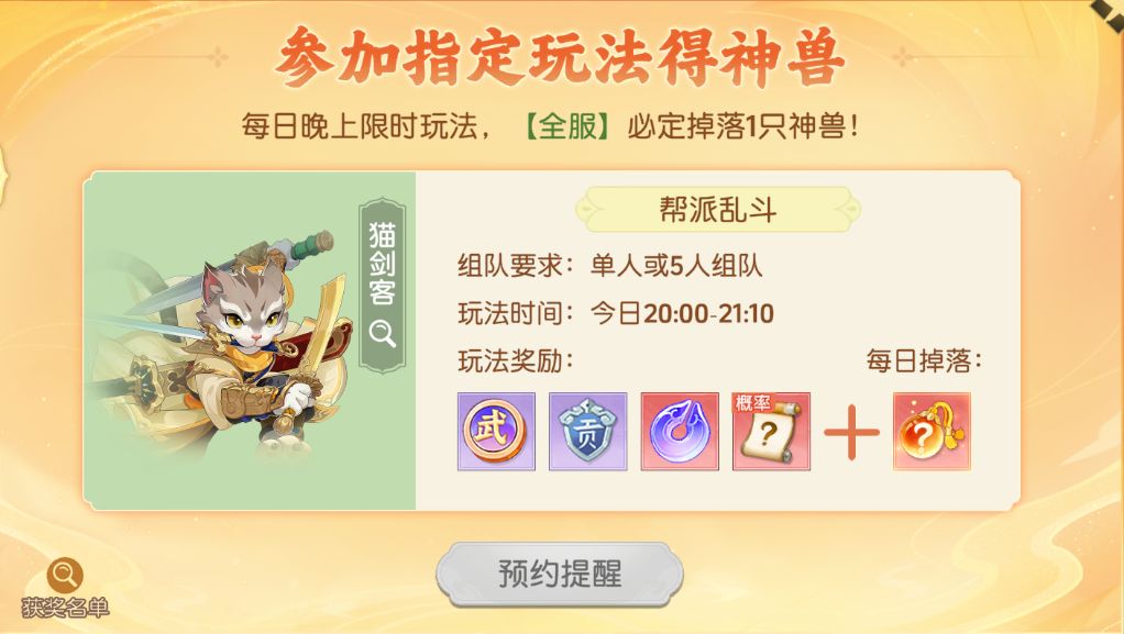 1、今天是离火庆典的最后一天,在今晚的限时活动帮派乱斗中,将送出离火庆典的最后一只神兽!