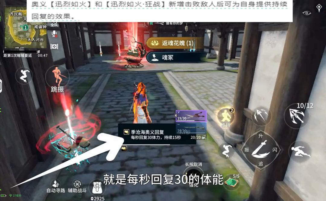就是我打死你,还可以加两格血,如截图中【每秒回复 30 的体能,持续 15 秒】就是 450 的血, 450 的血就可以回两个甲