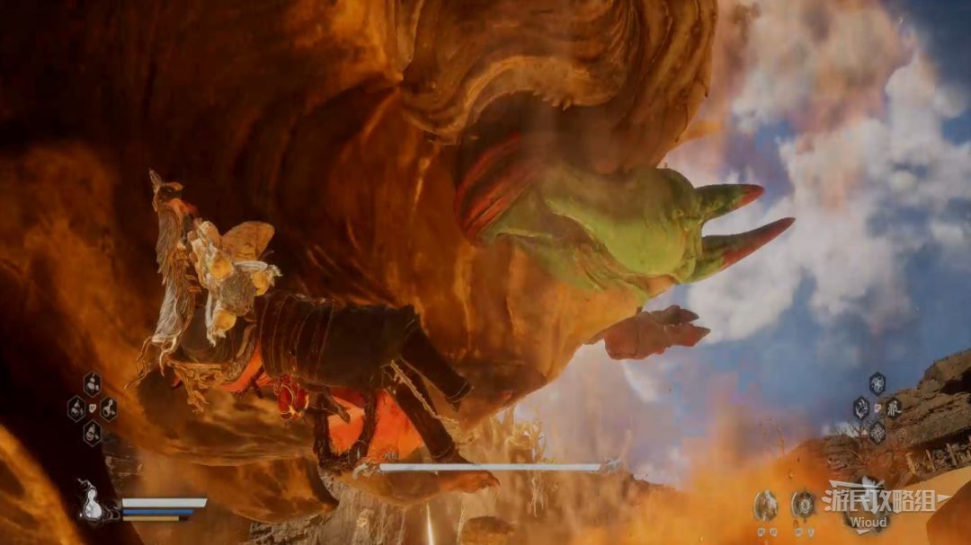 等我们消耗了蝜蝂半管血就会触发剧情,我们趁蝜蝂晕倒的时候爬到身上与佛头互动将宝物拿走,此时黄风大圣也会加入战斗,后面的战斗难度下降许多,与黄风大圣一同击败蝜蝂即可。