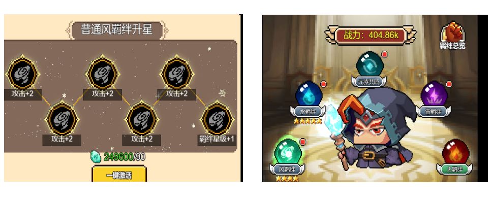 可以看出来,局外的元素羁绊养成也是十分重要的,毕竟可以给战斗中解锁如此强大的效果。那么升级所需的元素晶石和元素晶核又是在哪获取呢?这就是我们接下来要说的元素塔了!