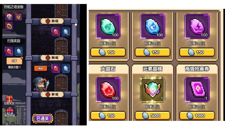 元素塔每一层挑战通过后都会给予对应的元素晶石奖励,以及无色原石用以在商店兑换晶核。而每挑战过一层,下一层的奖励就会越来越丰厚。每天也会有1次免费扫荡和2次广告扫荡次数,可以快速获取大量元素晶石和无色原石