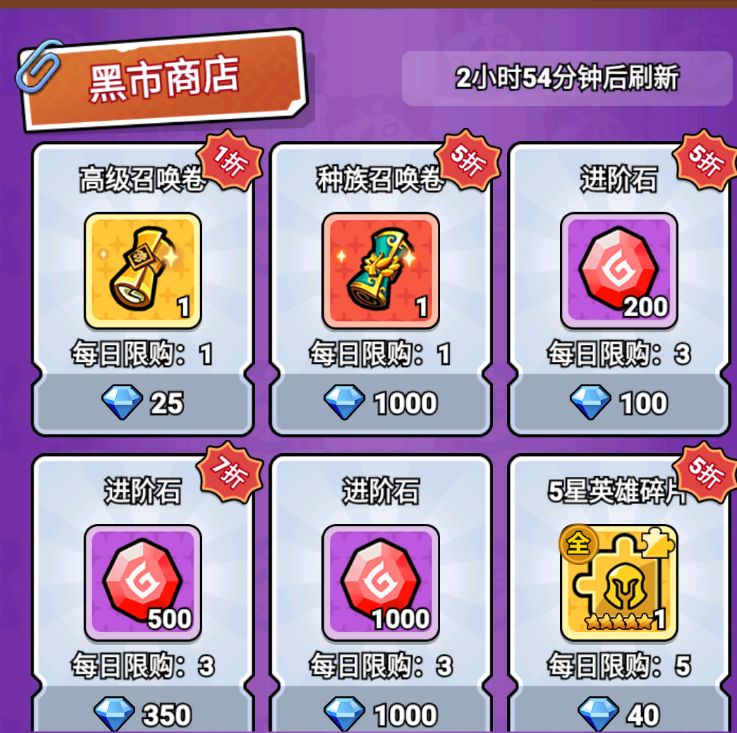 黑市商店是另一个钻石消耗的好地方。个人建议,可以购买高级召唤卷和5星英雄碎片。这两个物品是游戏中最为重要的资源之一,购买它们绝对不会后悔