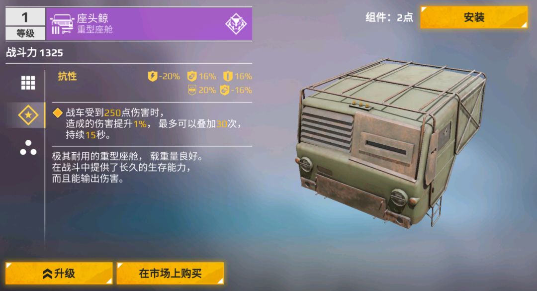 如同我们先前提到的,它也是“恶魔”座舱在被掠夺者转化以前的原型座舱。简单来讲,“座头鲸”在战车受到伤害时可以提升自身造成的伤害,因此很适合与具有高耐久或高伤害的武器搭配使用,此时“座头鲸”本身就是最坚实的装甲。